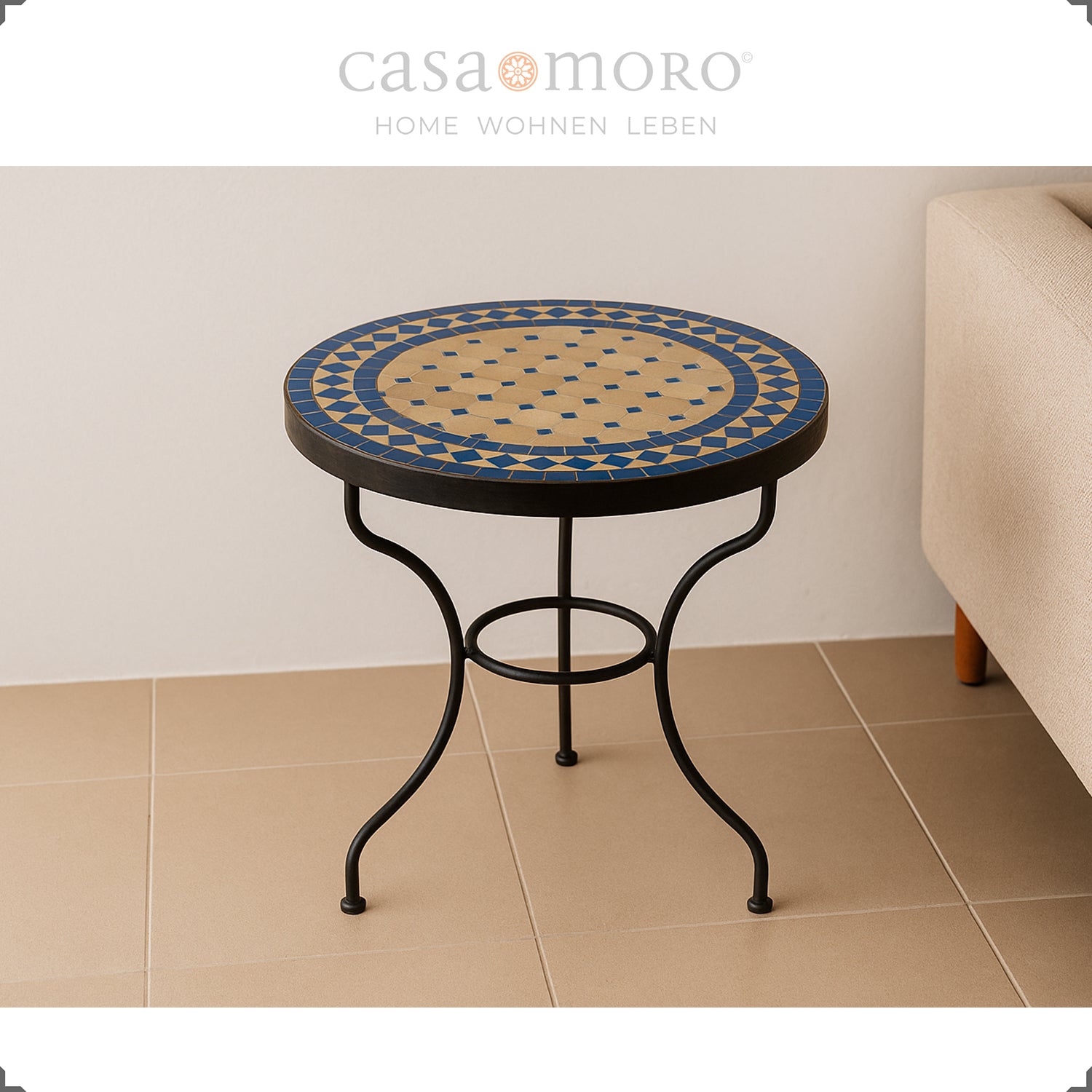 This small table with a diameter of 45 cm is a real all-rounder: as a plant table in the living room, a small side table on the balcony, or a mosaic table for the kitchen corner. The Zellige pattern in blue and terracotta brings a Mediterranean flair to any environment.
