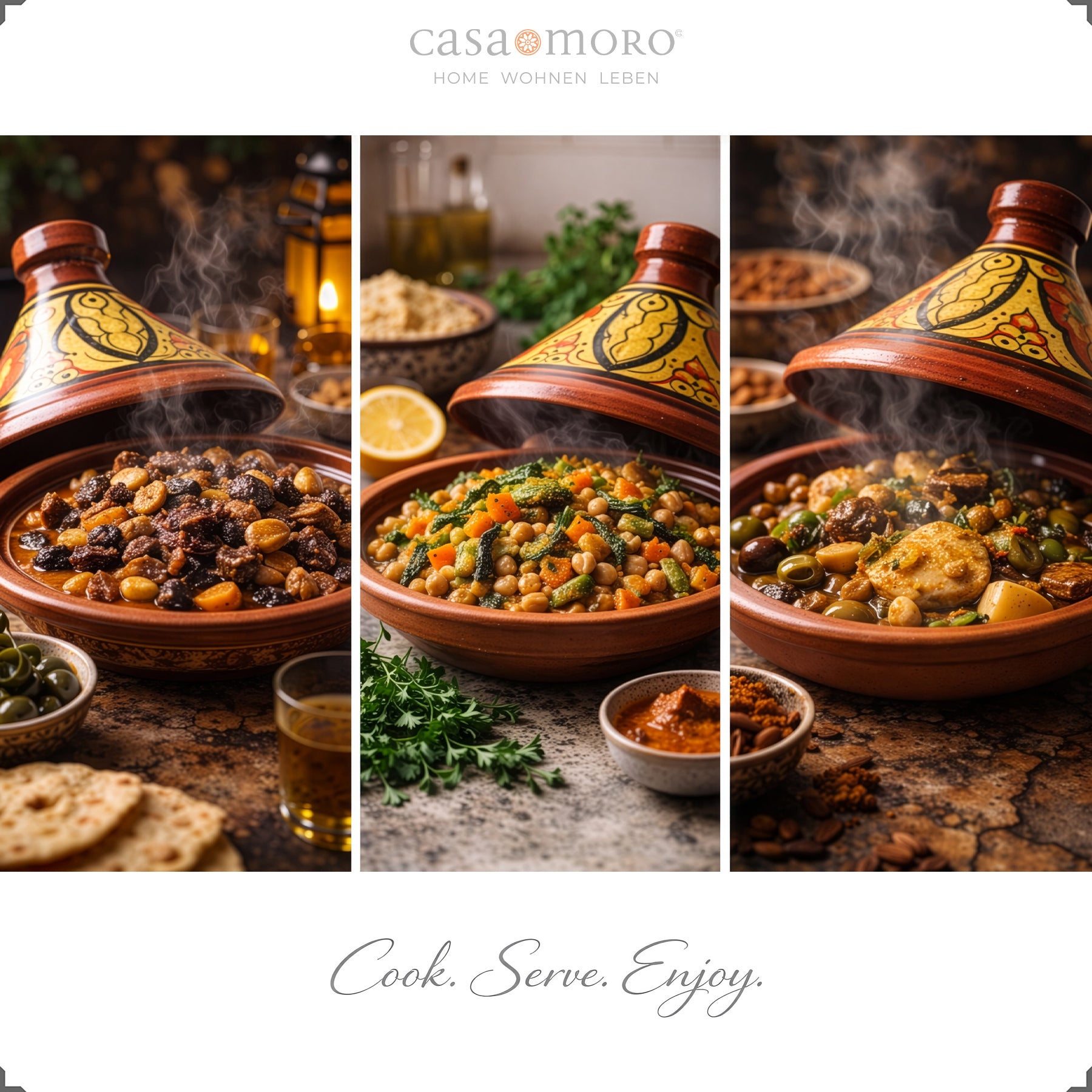 The glaze makes these Tajine particularly pleasant in daily use: it is easy to clean, has a high-quality appearance and supports a clean, clear aroma. At the same time, the cooking remains typically Moroccan: slow, fragrant and with the feeling that the ingredients have “time to develop”.
