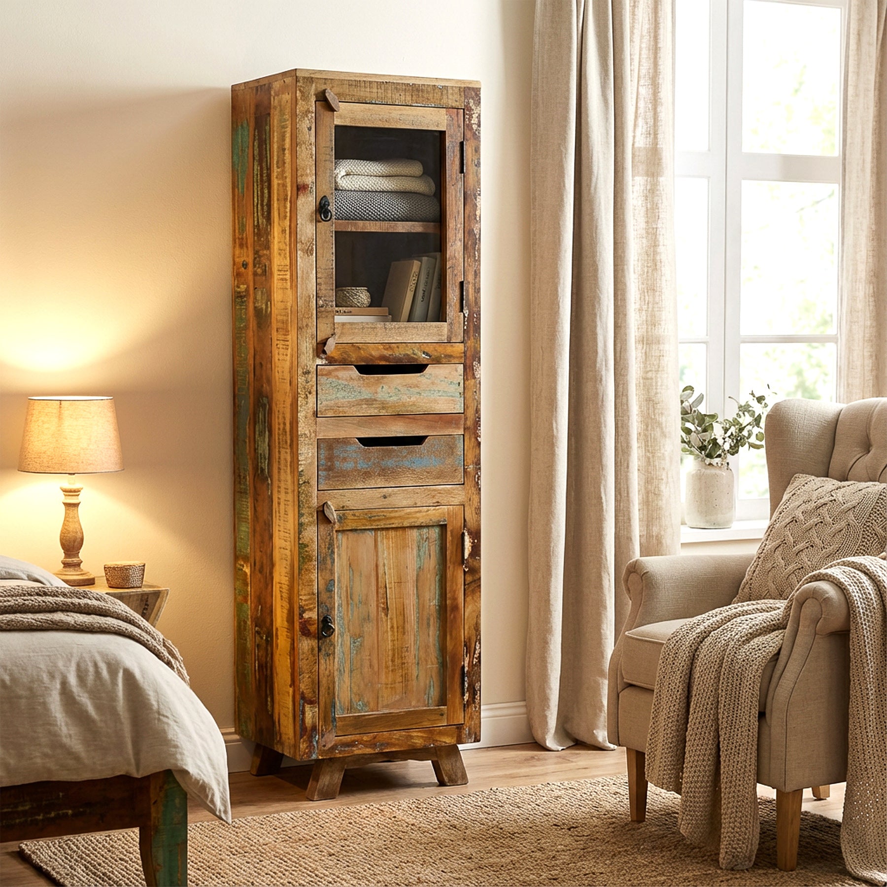 This living room cabinet looks like a calm vertical accent: slim, tidy and full of character. The lively wood appearance and the gentle patina bring warmth into the room without weighing it down. Whether as a display cabinet in the living room, as a tall cabinet in the hallway or as stylish storage space in the kitchen - this piece of furniture always remains pleasantly reserved and yet present.