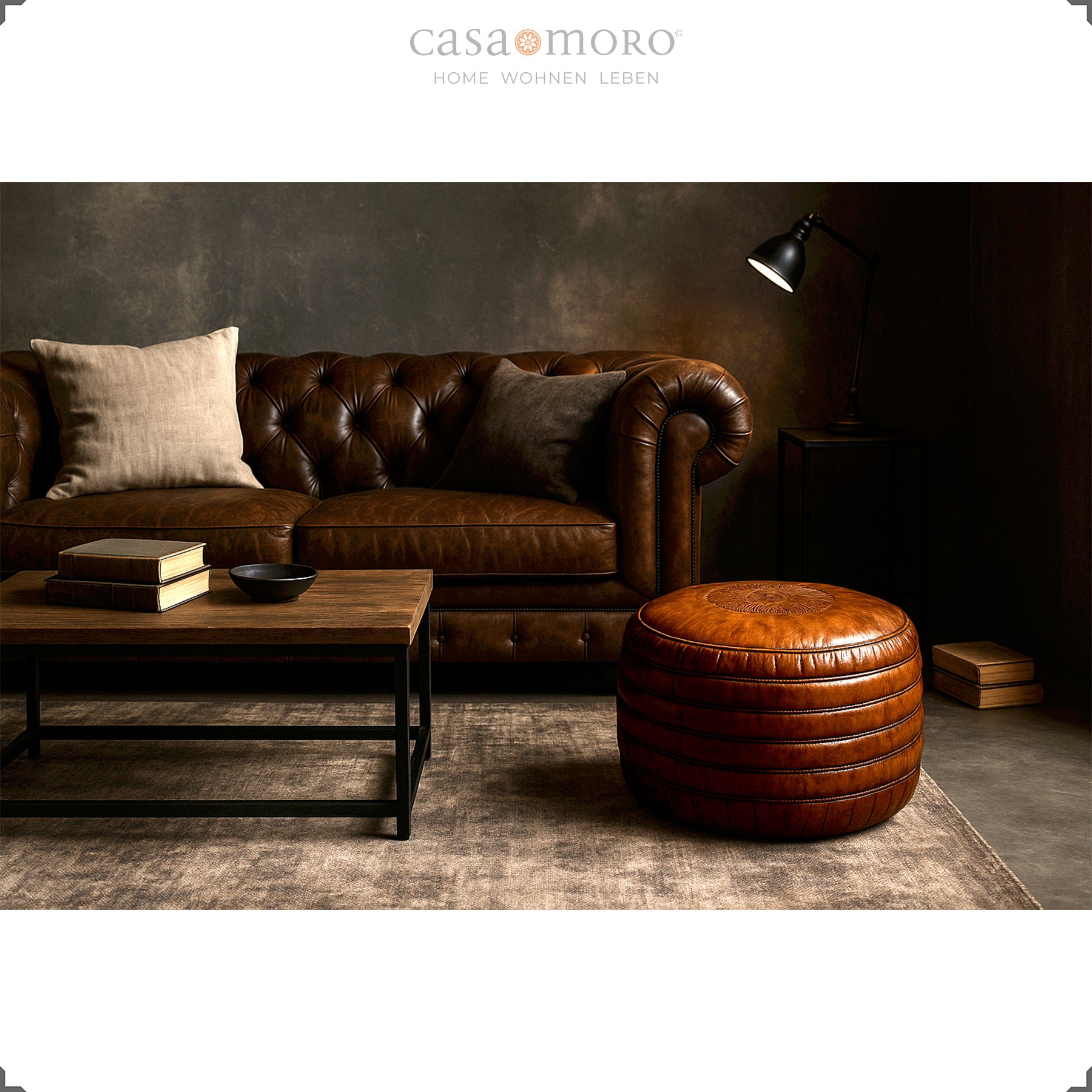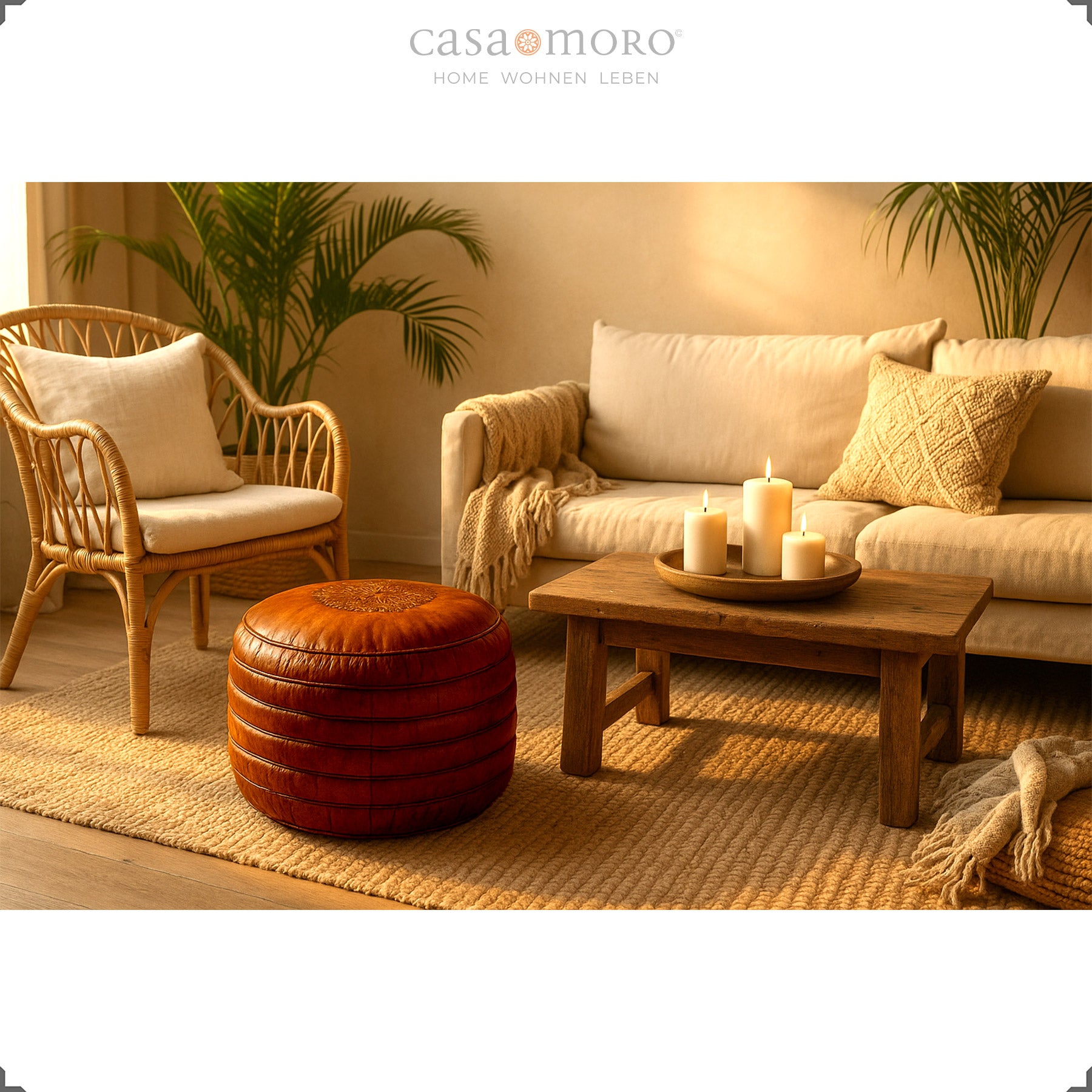 Marokkanische Sitzkissen / Hocker aus Leder - Teil des orientalisch arabischen Lebensstils. Marokkanisches Kunsthandwerk aus echtem Leder. In reiner Handarbeit gefertigt und mit marokkanischen Motiven fein geprägt.