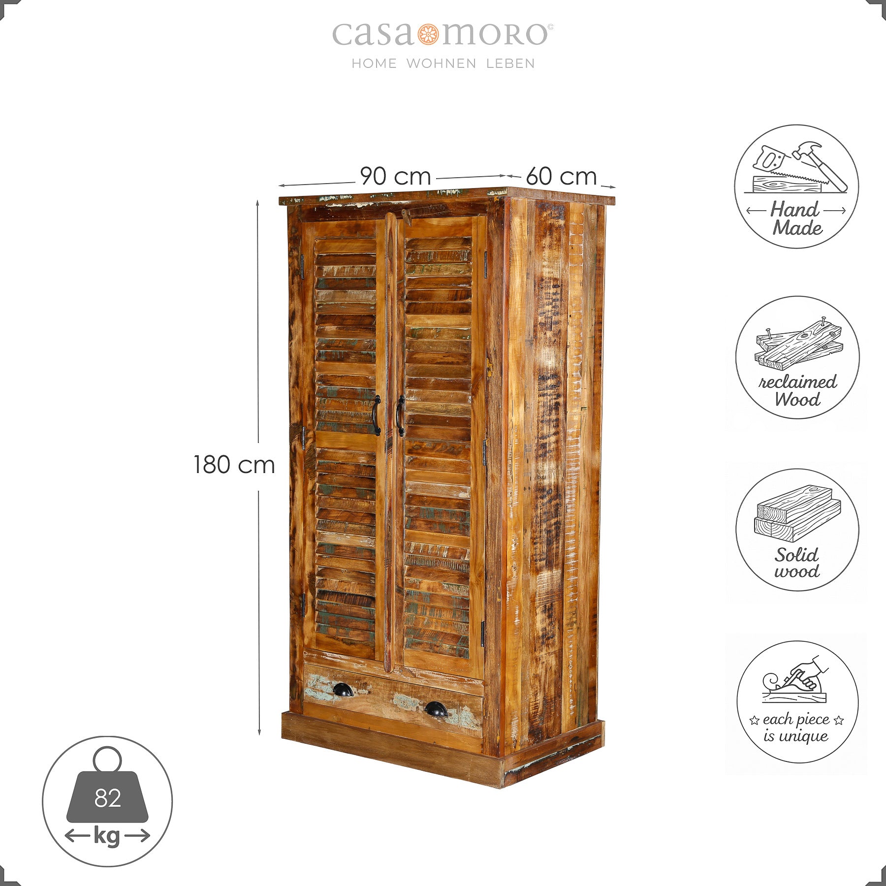 Made from reclaimed mango wood, this wardrobe is made from wood that has already been used: fallen trees, old boats and beams, floors and support beams from demolished buildings. This origin is reflected in fine traces, slight color changes and a surface that does not want to be smooth, but rather has character.