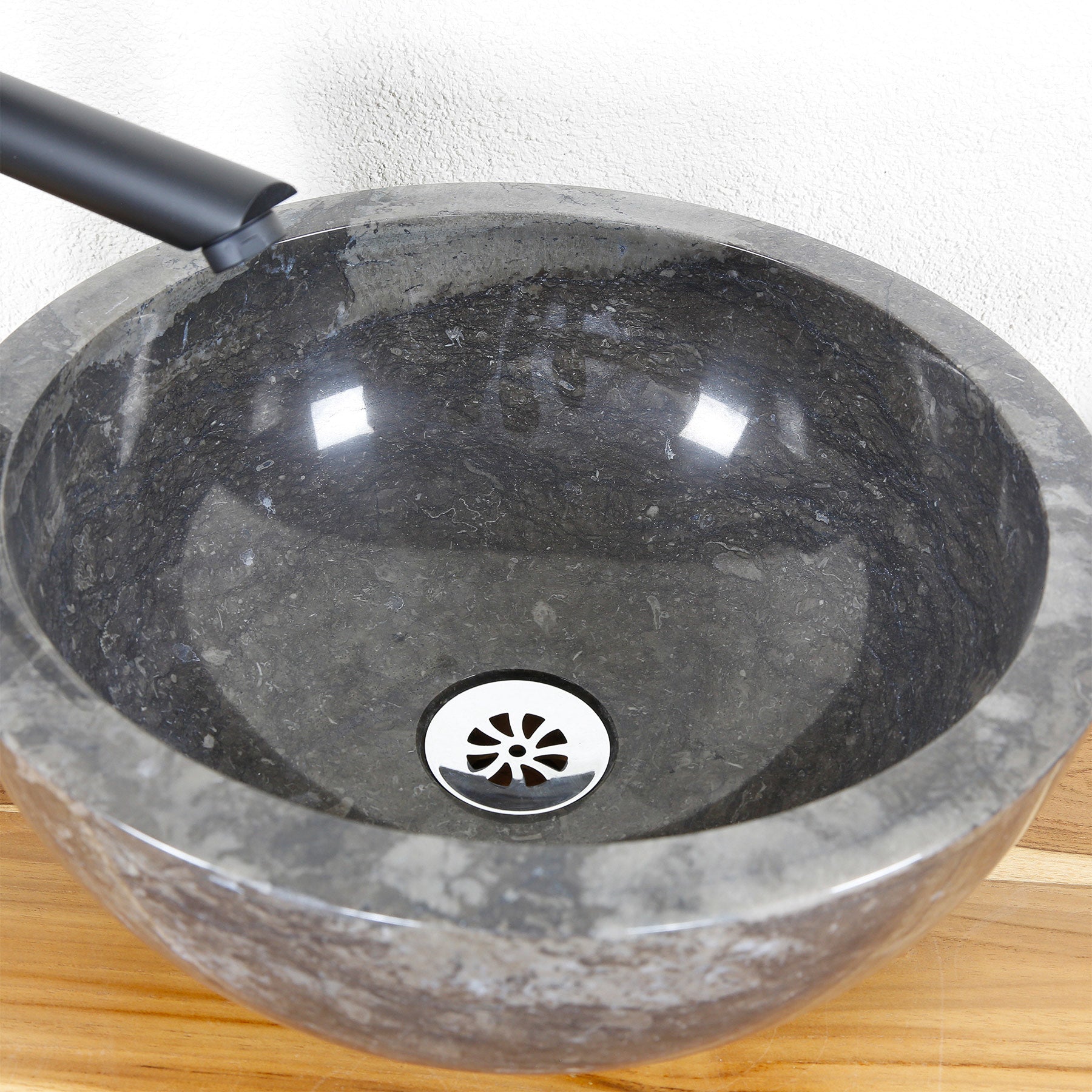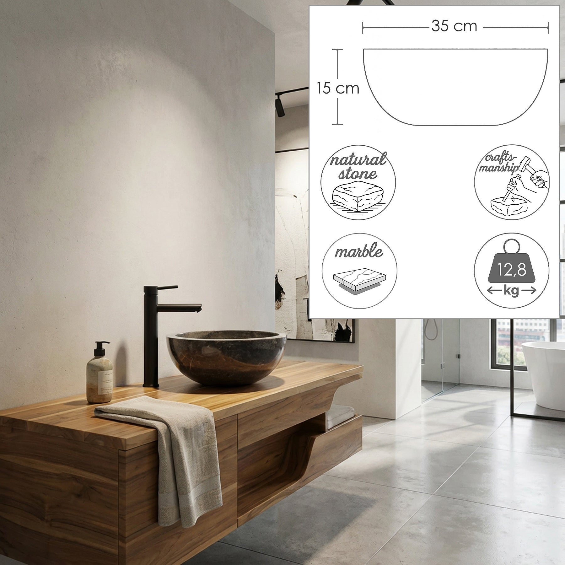 This round one Washbasin made of stone combines natural authenticity with a modern, elegant aesthetic. The smoothly polished surface in a dark marble look and the harmonious shape make the countertop washbasin a fine design object for stylish bathroom furnishings, guest toilets or warm wooden washbasins.