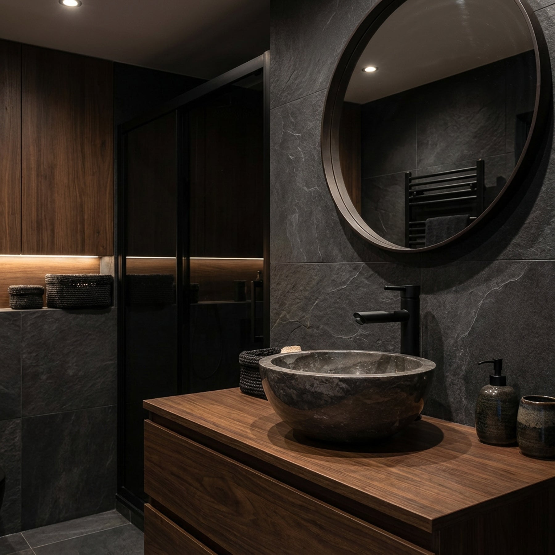 The natural stone shows a multi-layered color play of graphite gray, smoke gray and fine mineral accents. This natural structure gives the Basin Depth and character while the glossy polish gently reflects the light. Perfect for modern spaces that combine stone, wood and matte fittings.